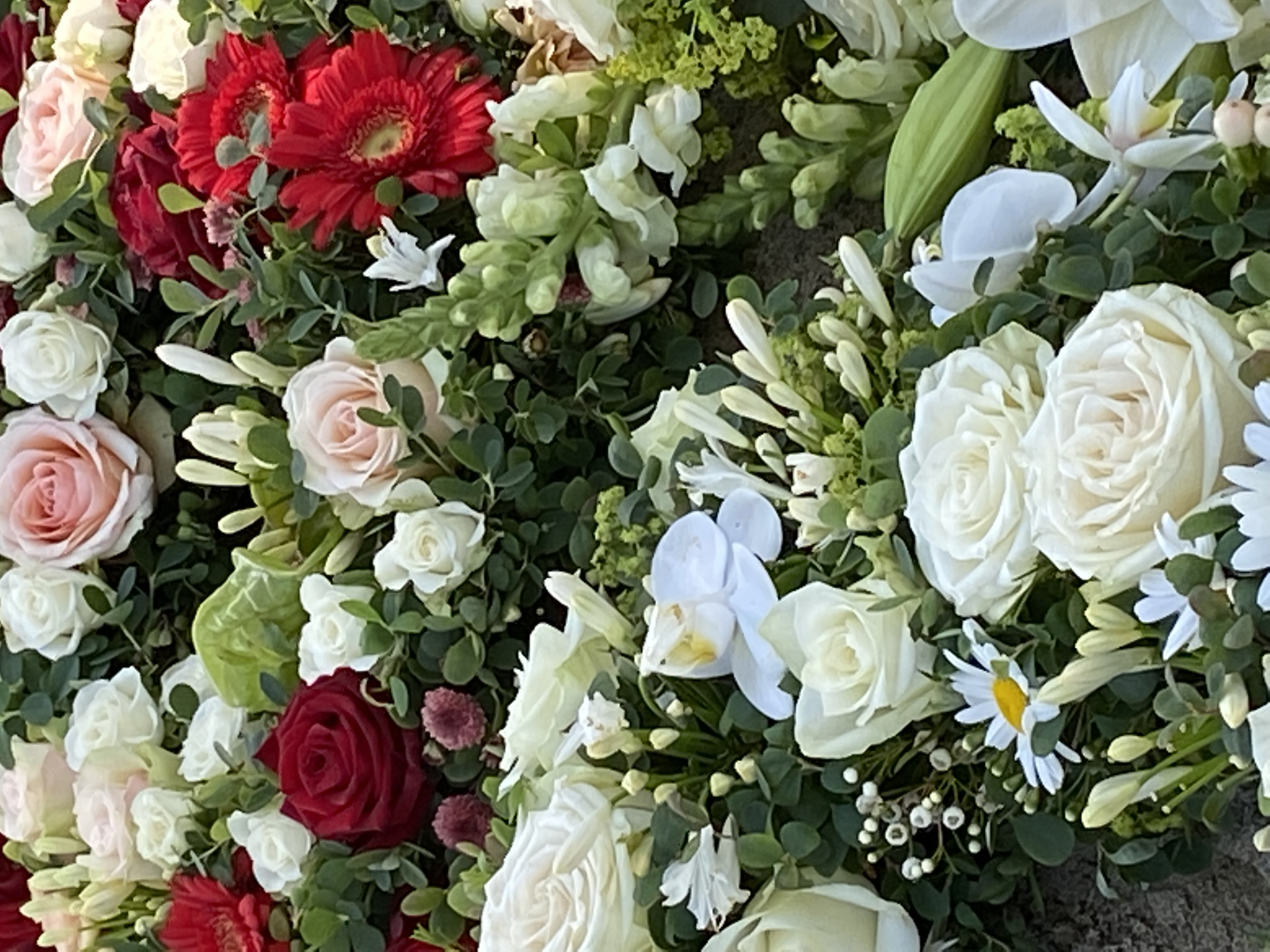 I gravferder der vi engasjeres bruker vi ulike pyntegjenstander, som lysestaker, blomsterkrakker og kasser, for å gi blomstene ulik høyde, og spill med hverandre slik at alt kommer til rette.